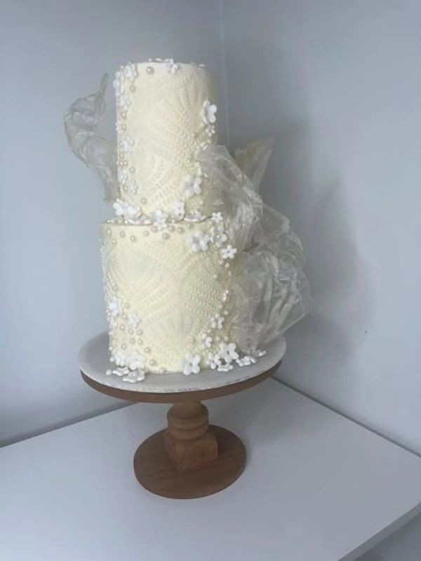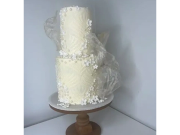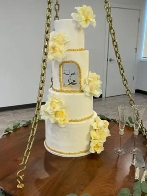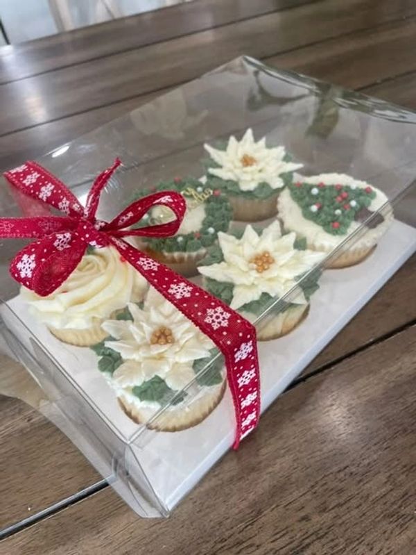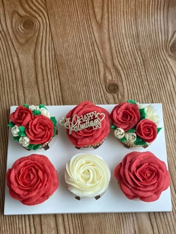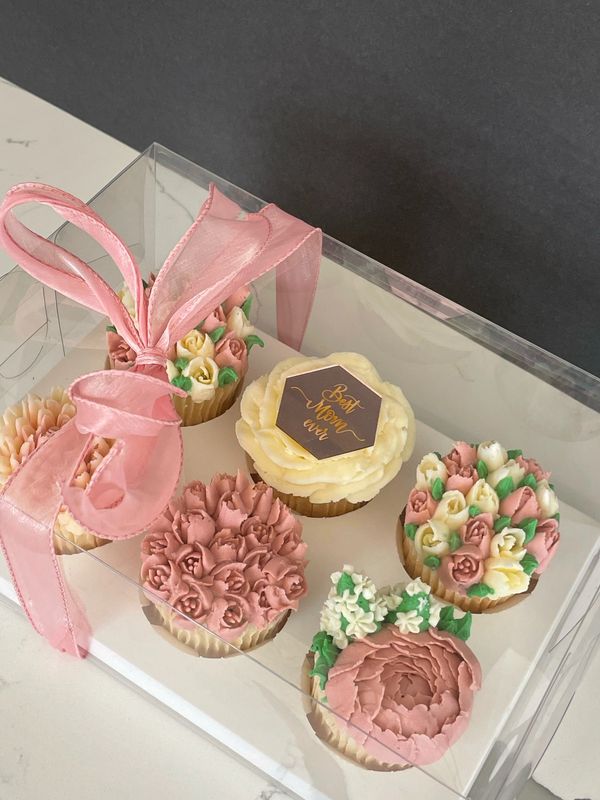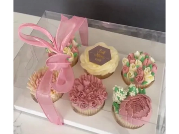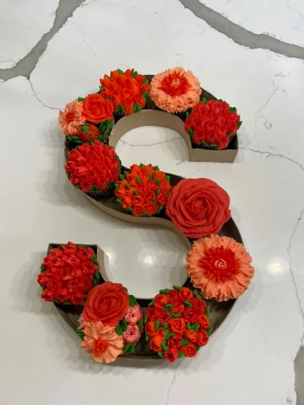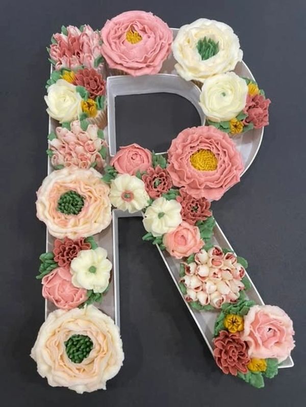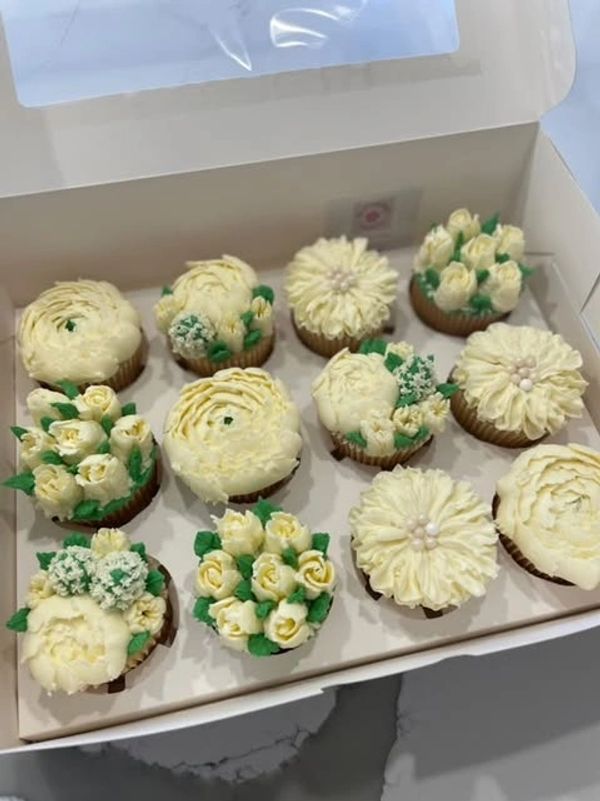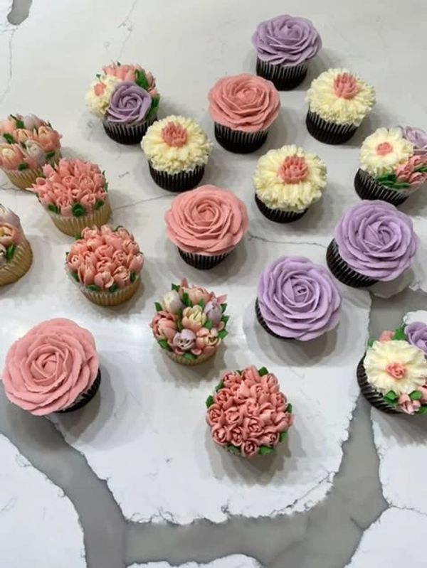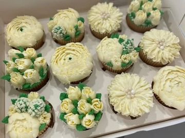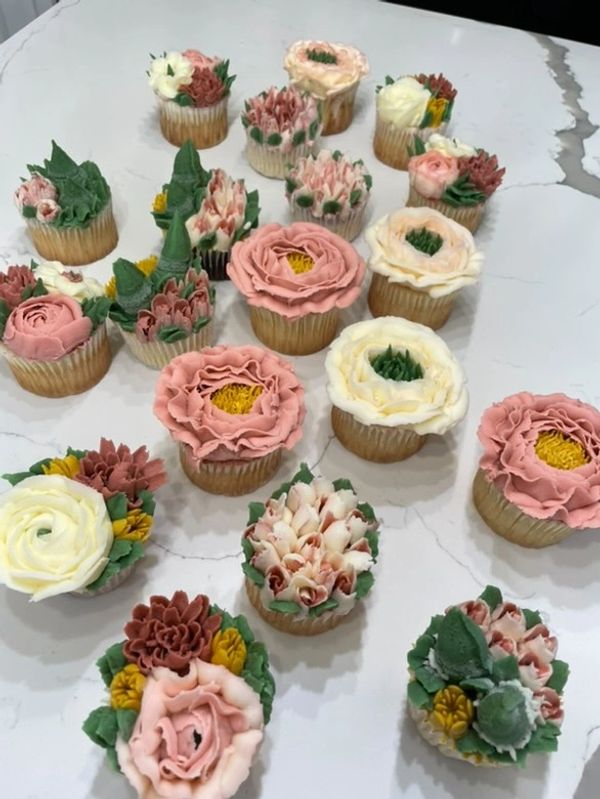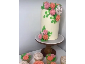 A beautifully designed cake with buttercream flowers, paired with cupcakes featuring the same floral design and colors, all customized to match the number of cupcakes you need.